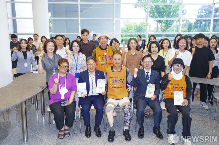 [광주=뉴스핌] 이휘경 기자 = 강기정 광주시장이 8일 오전 시청 1층 열린문화공간에서 '2025 경주 APEC(아시아태평양경제협력체) 성공 개최'를 기원하며 왼발 도보 종주에 나선 이범식(60)씨를 격려한 뒤 기념촬영을 하고 있다. 이씨는 8일 광주시청에서 출발해 오는 27일까지 21일간 경주까지 400km를 걸으며 APEC 성공개최를 기원하고 동서 지역간 화합의 메시지를 전달한다. [사진=광주광역시] 2025.07.08 hkl8123@newspim.com