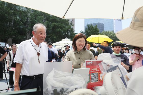 류진(왼쪽) 한국경제인협회 회장과 장미란 문화체육관광부 차관이 8일 서울 청계광장에서 열린 'K바캉스 캠페인'에 참석해 광역시도별 부스를 둘러보고 있다. 사진 한경협 |