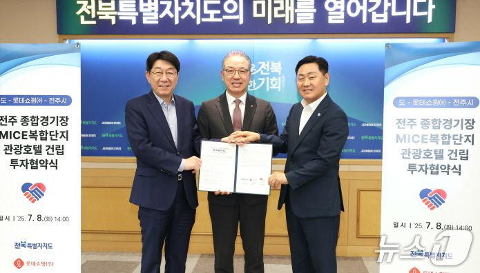8일 전북도에서 ‘전주 종합경기장 MICE 복합단지 관광호텔 건립 투자협약 체결식’이 개최됐다. 협약식에는 김관영 전북지사와 우범기 전주시장, 정준호 롯데쇼핑 대표 등 관계자들이 참석했다.(전주시청 제공, 재판매 및 DB 금지)/뉴스1