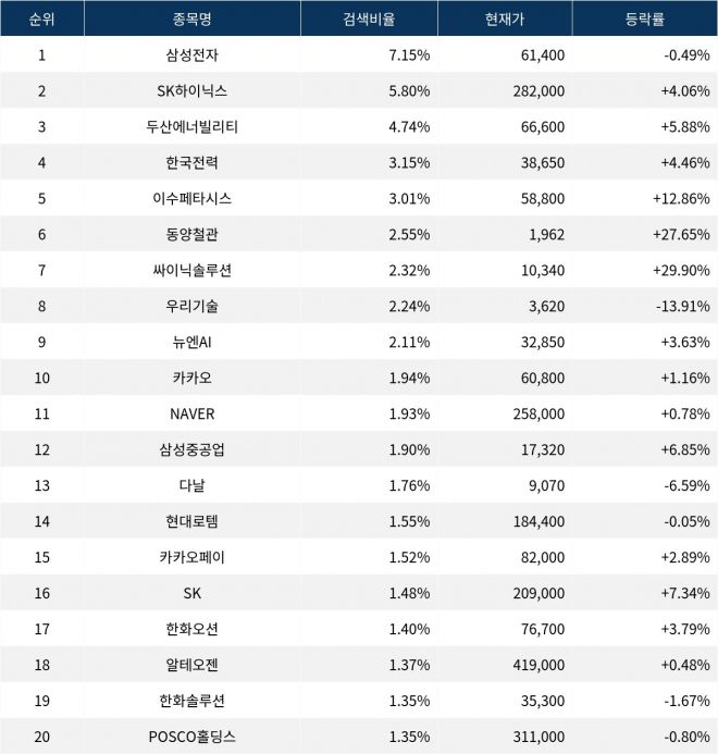 이어 검색비율 2위의 SK하이닉스(000660)는 상승률 4.06%로 상승 마감했다. 검색비율 3위의 두산에너빌리티(034020)는 5.88% 상승 마감했다. 검색비율 4위 한국전력(015760)은 상승률 4.46%로 상승 마감했다. 검색비율 5위 이수페타시스(007660)는 12.86% 급등하며 마감했다.