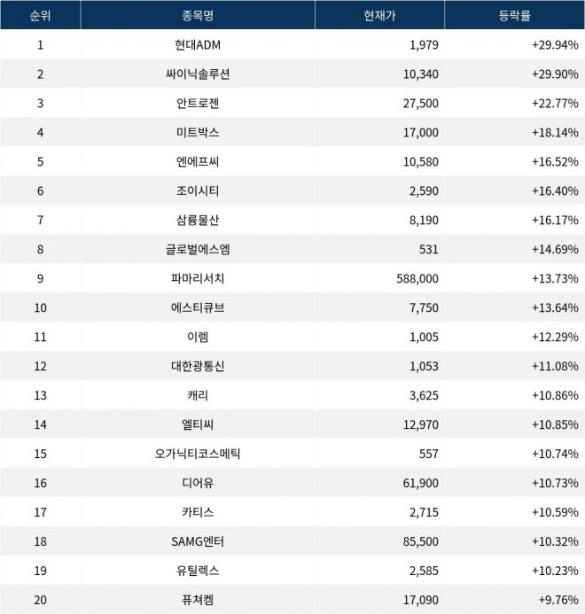 6위 조이시티(067000)는 종가 2,590원으로 16.40% 급등 마감했다. 7위 삼륭물산(014970)은 종가 8,190원으로 16.17% 급등 마감했다. 8위 글로벌에스엠(900070)은 종가 531원으로 14.69% 급등 마감했다. 9위 파마리서치(214450)는 종가 588,000원으로 13.73% 급등 마감했다. 10위 에스티큐브(052020)는 종가 7,750원으로 13.64% 급등 마감했다.