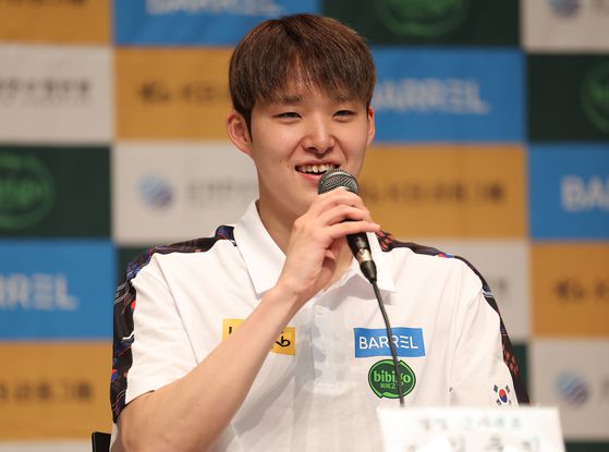 8일 충북 진천 국가대표 선수촌에서 열린 대한수영연맹 미디어데이에서 세계선수권 출전 각오를 밝히는 김우민. 연합뉴스 |