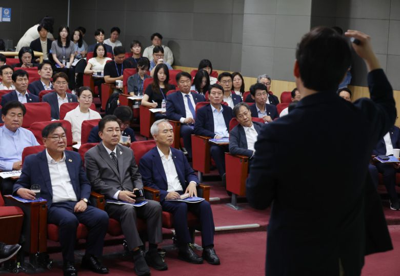 김병기 더불어민주당 원내대표와 김태년 의원 등 의원들이 8일 서울 여의도 국회 의원회관에서 열린 '경제는 민주당 : 코스피 5000시대 실현을 위해 민주당이 할 일 : ①부동산편' 특강에서 이광수 애널리스트의 강연을 듣고 있다. 2025.07.08. |