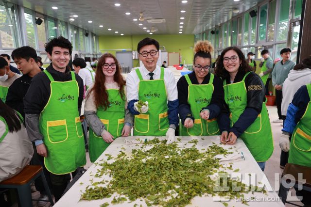 ▲김철우 군수와 보성다향대축제를 방문한 외국인들이 함께 차를 덖고 있다ⓒ보성군 |