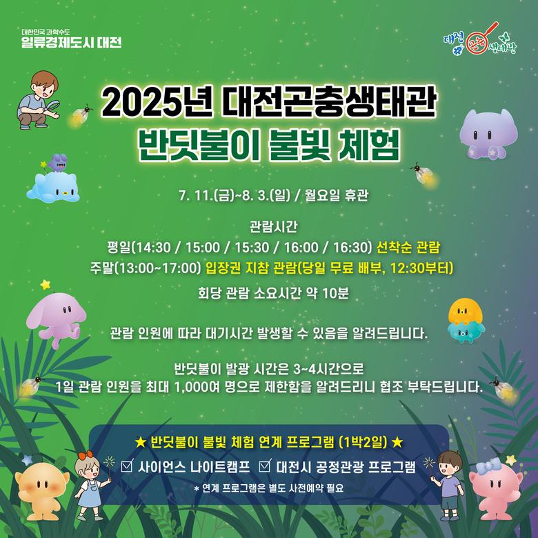 임성복 대전시 농생명정책과장은 “자연에서 점차 사라지는 반딧불이를 가까이서 만날 수 있는 소중한 기회가 될 것”이라며 “작은 생명이 전하는 빛의 신비로움과 곤충의 생태적 가치를 직접 체험해 보길 바란다”고 말했다.