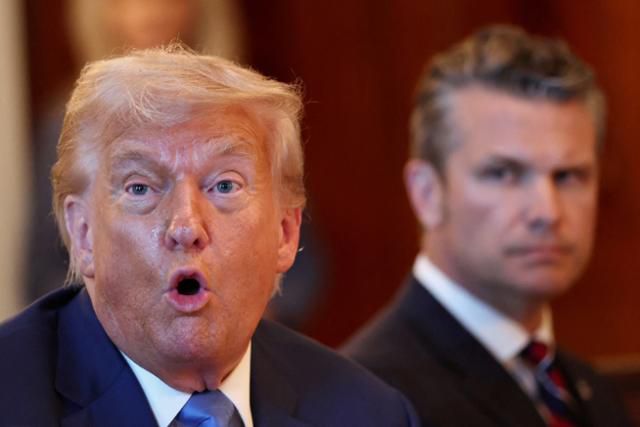 도널드 트럼프(왼쪽) 미국 대통령이 7일 미 워싱턴 백악관에서 열린 베냐민 네타냐후 이스라엘 총리와의 만찬 도중 발언하고 있다. 오른쪽은 피트 헤그세스 미국 국방장관. 워싱턴=로이터 연합뉴스 |