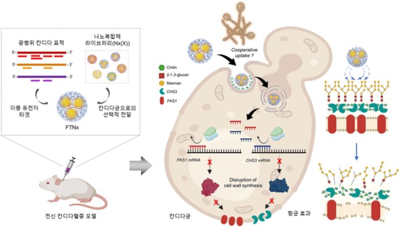 정 교수팀은 서울아산병원 정용필 교수팀과 협력해 칸디다 세포벽의 두 핵심 효소를 동시에 저해하는 유전자 기반 나노치료제(FTNx)를 개발했다.