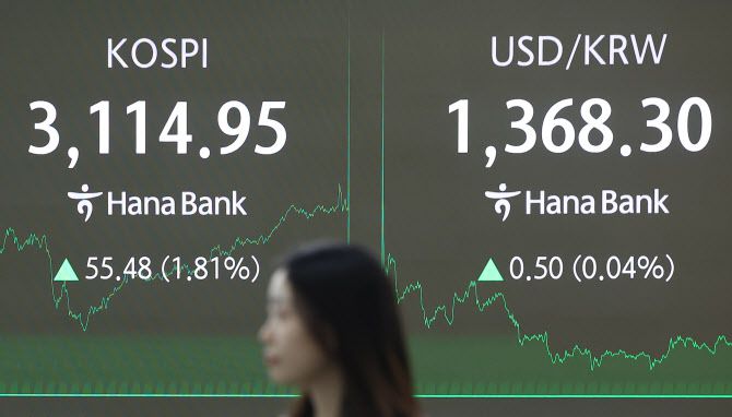 코스피가 3,110대를 회복하며 장을 마감한 8일 서울 중구 하나은행 본점 딜링룸에 코스피, 코스닥지수 및 환율이 표시돼 있다. (사진=연합뉴스) |