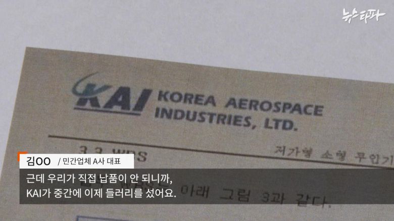 "왜 국과연과 직접 계약을 맺지 않았냐"는 질문에 김 대표는 “우리가 직접 납품이 안 되니까 KAI가 중간에 들러리를 섰다. 국가에서도 뭐 대기업을 앞세워서 해라 이런 게 있잖나. 대기업을 끼고 하는 게 좋겠다라고 중간에서 얘기를 해서 KAI가 붙었다”고 해명했다.