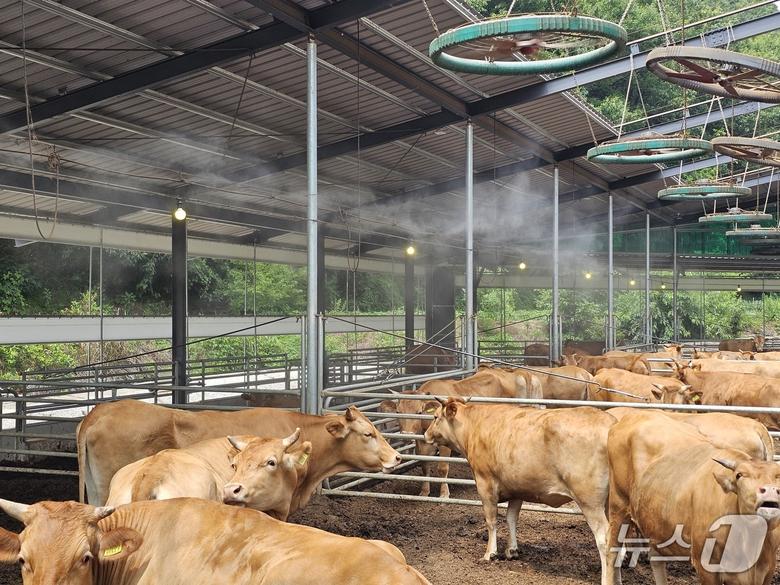 연일 폭염이 이어지는 8일 경남 합천군 삼가면 한 한우 농장에 살수시설이 가동되고 있다. 2025.7.8./뉴스1 한송학 기자 |