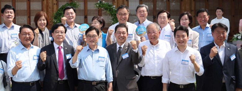 류진 한경협 회장 등이 8일 '내수 경제를 살리는 K-바캉스 캠페인'에 참석해 기념촬영을 하고 있다. 앞줄 왼쪽부터 김교흥 더불어민주당 국회의원, 송언석 국민의힘 원내대표, 우원식 국회의장, 김병기 민주당 대표 직무대행 겸 원내대표, 류 회장. 이충우 기자