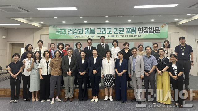 ▲국회의원 연구모임 '건강과 돌봄 그리고 인권 포럼' 소속 의원들이 광주 수완동행정복지센터를 방문해 광주다움 통합돌봄 체계를 확인하고 기념촬영을 하고 있다.ⓒ광주광역시 |