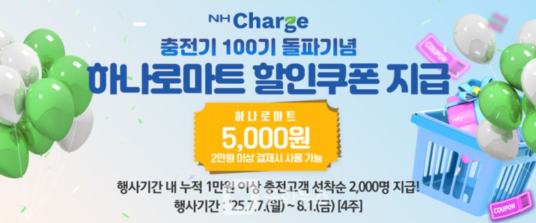 이번 행사는 이달 7일부터 다음달 1일까지 약 4주간 진행된다. 행사 기간 동안 전국 NH Charge 충전소에서 누적 1만 원 이상 충전한 고객 선착순 2천 명을 대상으로 농협하나로마트 5천 원 할인쿠폰을 증정한다.
