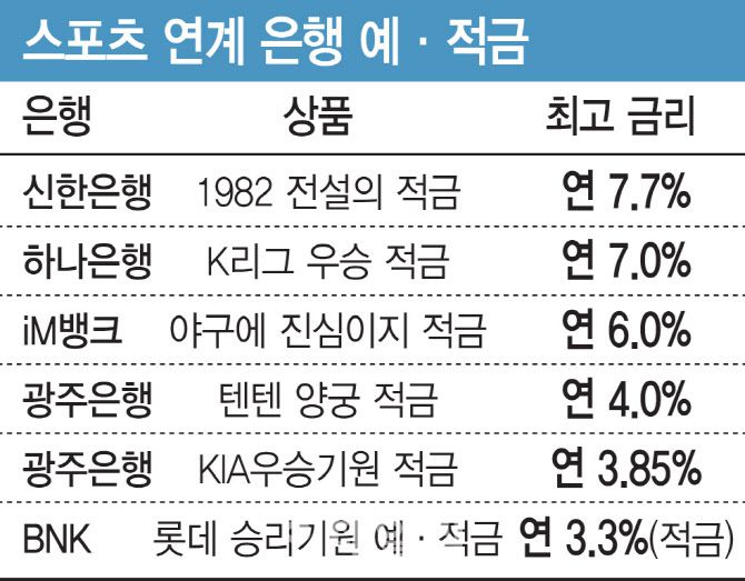 iM뱅크는 시중은행 전환 1주년 등을 기념해 ‘야구에 진심이지 적금’을 출시했다. 이 적금은 기본금리 연 1.35%에 입금할 때마다 연 0.15%포인트를 더해 최고 연 6% 금리를 제공한다. 최고 금리를 받으려면 회차 별 납입금액 100원 이상~5만원 이하를 31일간 매일 직접 이체로 입금해야 한다. 광주은행은 지역 명문구단인 기아타이거즈와 연계한 ‘KIA타이거즈 우승기원 적금’이 대표 스테디셀러 시즌 상품이다.