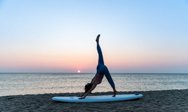 양양군 체육회가 이달부터 10월까지 '서핑·카누·황포돛배 무료체험교실'을 운영한다. 사진은 서핑 요가 모습. /양양군 |