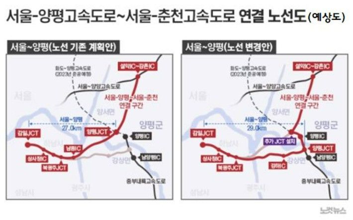 특히 그는 서울~양양(춘천) 고속도로와의 '장래 연결 가능성'을 염두에 둔 합리적 노선임을 부각하며 원안의 우수성을 강조해 왔다. 김건희씨 일가 땅이 몰려 있는 강상면 종점안이 추진되면서, 기존 양서면 종점안의 핵심 장점인 향후 상위 고속도로와의 연계성이 배제된 문제점을 지적한 것이다.
