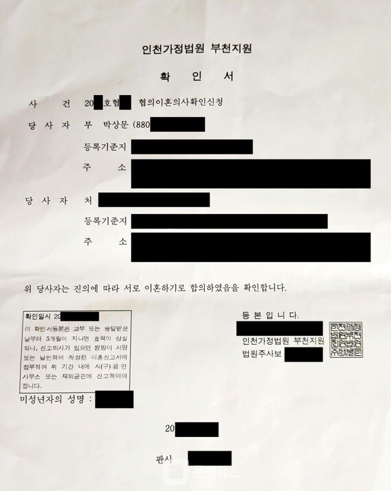 제이지스타가 소속 아티스트 신지의 예비 배우자 문원 씨를 둘러싼 각종 논란과 의혹에 대해 공식 입장을 밝혔다. 사진은 문원 씨의 이혼 당시 협의이혼 합의서 / 사진제공=제이지스타