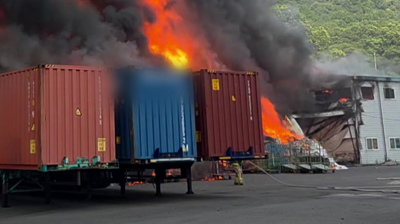 대형 컨테이너가 놓여있는 공장에서 시뻘건 불길과 새까만 연기가 치솟습니다.