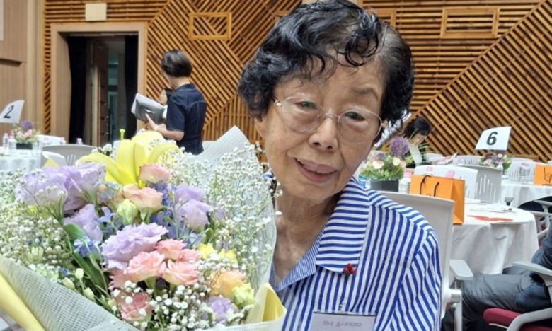 폐지와 깡통 수집 등으로 평생 모은 돈을 고향의 아이들을 위해 내놓은 박순덕(89) 할머니가 지난달 11일 전북 전주 치명자산성지 평화의전당에서 열린 ‘희망2025캠페인 유공자 시상식’에서 전북도지사 표창을 받은 뒤 축하의 꽃다발을 안고 있다. 정읍시 제공