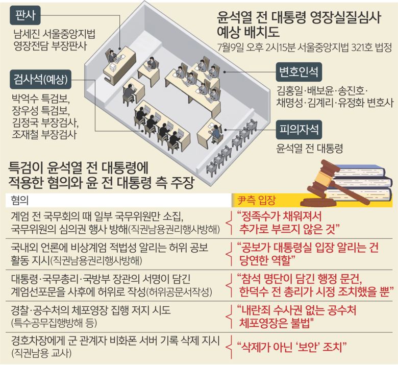 윤석열 전 대통령 구속을 가를 영장심사가 9일 열린다. 내란 특별검사팀(조은석 특검)은 범죄가 중대하고 증거인멸 등 우려가 있다는 점을, 윤 전 대통령 측은 혐의가 소명되지 않았다는 점을 강조할 것으로 예상된다. 법원의 영장 발부 여부가 수사의 향배를 가를 수 있어 양측은 사활을 건 다툼을 예고하고 있다.