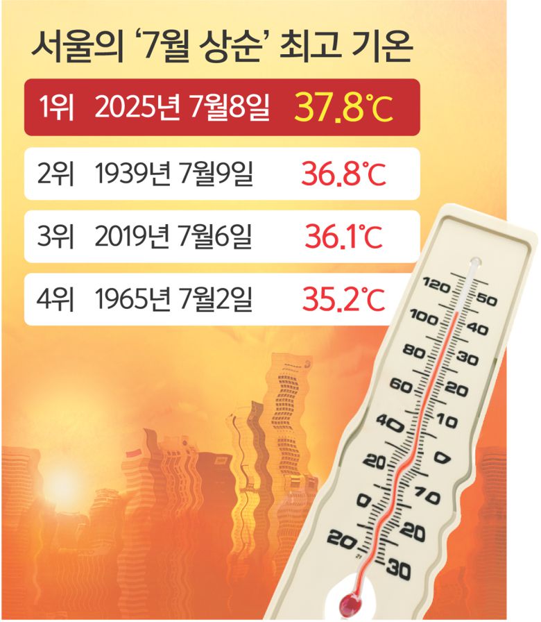 기상청에 따르면 8일 서울 낮 최고기온은 37.8도를 기록했다. 7월 상순 기준 서울 기온 역대 최고치를 갈아치웠다. 이전 최고기온은 1939년 7월9일 기록한 36.8도였는데 이를 86년 만에 갈아치운 것이다. 서울에서 근대적 기상관측이 1907년 10월 시작돼 7월 기온관측이 1908년부터 이뤄졌다는 점에서 이날은 7월 상순 기준 117년 만에 가장 더운 날로 기록될 예정이다.