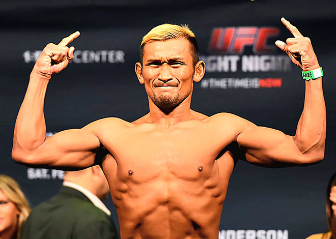 구니모토 기이치가 2015년 2월 미국 콜로라도주 브룸필드 퍼스트 뱅크 아레나 UFC 파이트 나이트 60 계체 통과 기념 촬영을 하고 있다. 사진=TKO