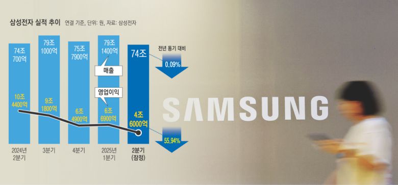 삼성전자는 연결 기준 올해 2분기 영업이익이 4조6000억원으로 지난해 같은 기간보다 55.94% 감소한 것으로 잠정 집계됐다고 8일 공시했다. 매출액은 74조원으로 전년 동기 대비 0.09% 줄었다. 앞서 증권가가 예측한 매출 76조5000억원, 영업이익 6조4000억원을 크게 밑도는 수치다.