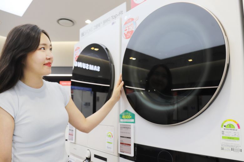 롯데하이마트 모델이 8일 으뜸효율 환급사업 대상인 세탁기를 보고 있다. 롯데하이마트 제공