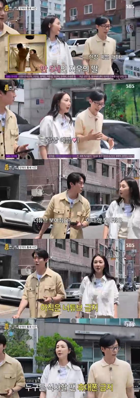 유연석은 "유튜브를 보여주느냐"고 물었고, 최지우는 "안 보여준다. 아직은 영상은 안 보여주고 있다"고 단호하게 말했다. 이를 들은 유재석과 유연석은 "그게 쉽지 않다. 식당에 가면 다 유튜브를 보여주고 있던데"라고 했다.