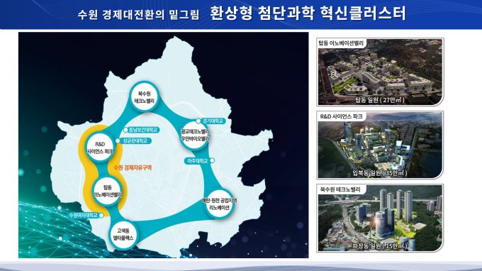 '환상형 클러스터'는 '탑동IV'를 시작으로 R&D사이언스파크, 북수원테크노밸리, 광교테크노밸리, 우만테크노밸리, 매탄원천 공업지역 리노베이션, 고색동 델타플렉스 등 수원 전역을 둥글게 잇는 첨단과학산업밸트다.