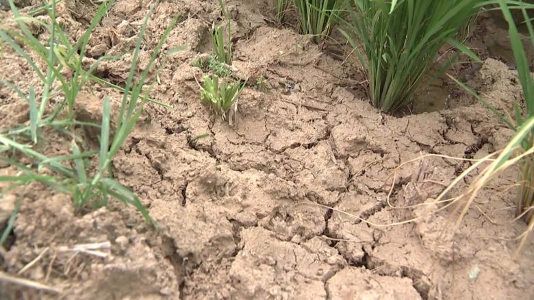 바짝 말라붙은 저수지 바닥은 풀밭처럼 변했고, 한때 물에 잠겼던 나무들은 밑동까지 보입니다.