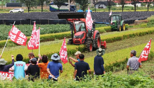 지난해 9월 경기 안성시 미양면 한 논에서 전국농민총연맹 경기도연맹 관계자와 농민들이 쌀값 보장 등을 요구하며 논을 갈아엎고 있다. 연합뉴스