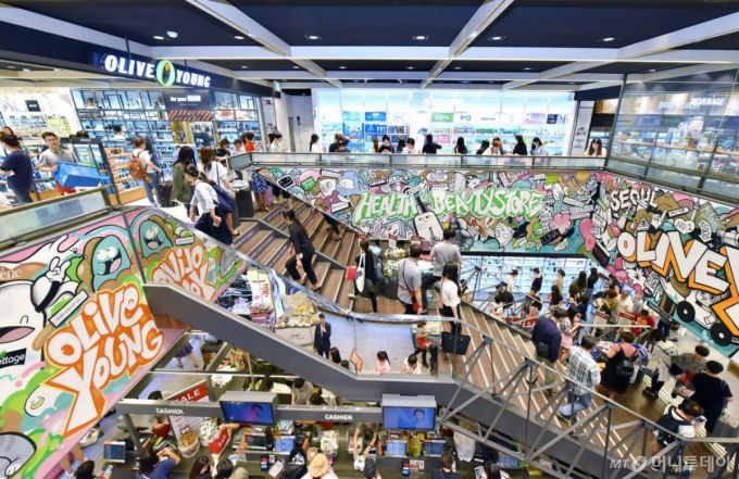 올리브영 명동 플래그십 스토어에서 쇼핑하고 있는 고객들