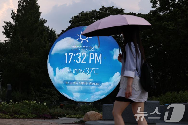 전국 대부분 지역에서 최고 체감온도가 35도 안팎으로 오르며 무더운 날씨가 이어진 8일 서울 송파구의 한 조형물에 현재 온도가 표시돼 있다. 2025.7.8/뉴스1 ⓒ News1 구윤성 기자