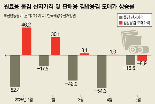 ‘국민 반찬’ 김값이 고공행진하고 있다. 판매용 김의 제조 원료인 산지 물김 생산량은 늘었으나, 이를 마른김으로 가공할 여력이 충분하지 않아서다. 정부가 이번 2차 추가경정예산으로 김 건조기 지원 사업에 60억원을 투입하기로 한 가운데, 소비자가 가격 안정을 체감하려면 내년은 돼야 한다는 전망이 나온다.