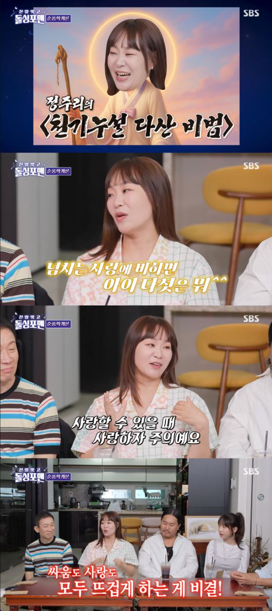 아이 다섯을 둔 정주리는 “많이 사랑하는 거에 비해서는 흉년이다”라는 말을 한 적이 있다고. 정주리는 “사랑할 수 있을 때는 틈나는대로 사랑하라는 주의다”라고 설명했다. 정주리는 뜨겁게 사랑하고 뜨겁게 싸운다고.