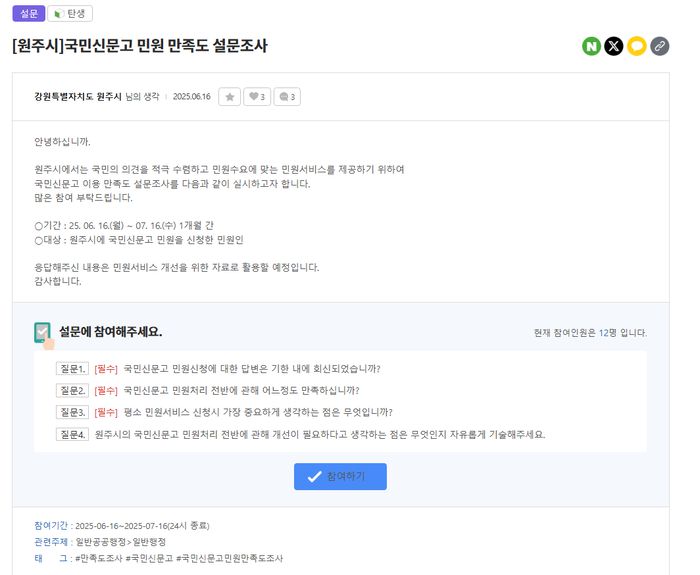 [스포츠서울ㅣ원주=김기원기자]원주시는 2025년 민원행정서비스 만족도 설문조사를 실시한다.