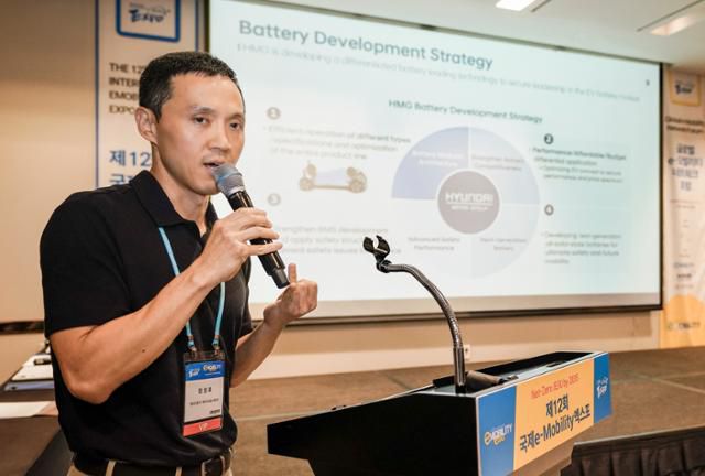 정창호 현대차·기아 기술연구소 배터리성능개발실장이 8일 제주 서귀포시 신화월드에서 열린 글로벌 e-모빌리티 네트워크 포럼에서 발표를 하고 있다. 한국자동차기자협회 제공 |