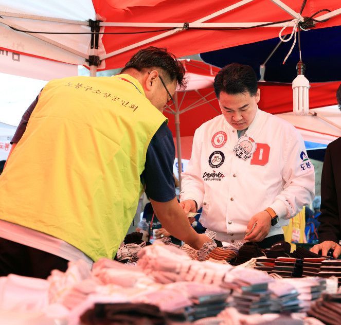 오언석 도봉구청장이 6월 열린 ‘2025년 도봉구 소상공인 행복장터’에서 소상공인 물품을 둘러보고 있다. |