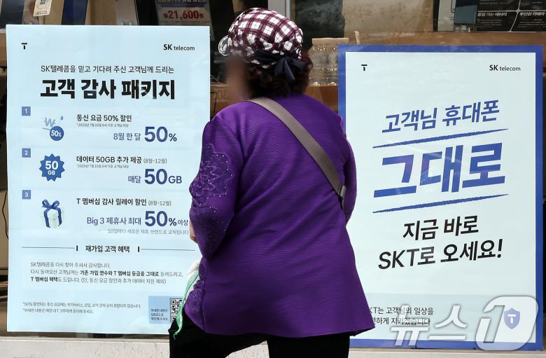 SK텔레콤이 사이버 침해 사고 이후 번호 이동하는 가입자에 대한 위약금 면제를 결정한 가운데 7일 서울의 한 SKT 공식매장에 '고객 감사 패키지' 안내가 붙어 있다. 2025.7.7/뉴스1 ⓒ News1 이동해 기자 |