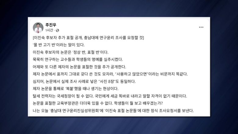주 의원은 오늘(9일) 충남대 연구윤리진실성위원회에 표절 논문에 대한 정식 조사요청서를 보내겠다고 밝혔습니다.