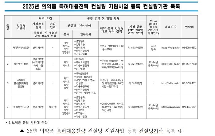지난 2022년부터 컨설팅기관으로 등록 및 수행해오고 있는 특허법인 정진의 김순웅 대표변리사는 “다양한 컨설팅 수행경험과 변리사를 비롯해 수의사, 약사 등 의약품 분야 최적화된 전문인력을 보유한 만큼 올해 사업 수행에도 최선을 다할 것”이라고 밝혔다.