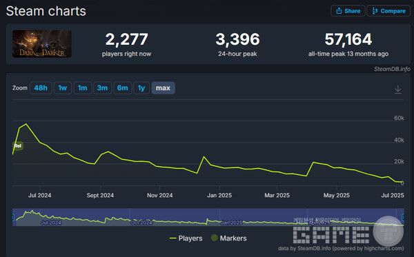 다크앤다커는 스팀 최고 동시 접속자 10만명, 누적 이용자 200만명, 스팀 역대 위시리스트 탑2를 기록하는 등 전 세계적으로 인기를 끌었다. 하지만 2024년 6월 스팀 재출시 이후 상황이 급변했다. 게임이 부분유료화로 전환되면서 일부 콘텐츠가 유료 상품으로 바뀌었고, 무료 유저는 획득 가능한 장비 등급에도 제한이 생겼다. 초기에는 "게임성이 살아났다"는 평가와 함께 동접이 2배 상승하는 모습을 보였지만, 시간이 지나면서 유저들의 혹평이 쏟아지기 시작했다. 결국 한때 5만명 수준을 유지하던 동시접속자 수가 최근 3천명 수준까지 급감하는 상황에 이르렀다.