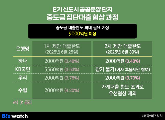 9일 분양업계에 따르면 최근 2기 신도시 중 한 곳에 조성한 2개 단지를 공공분양 중인 시행사는 KB국민은행으로부터 지난달 30일 집단대출 불참 의사를 전달받았다. KB국민은행은 기존 4개 중도금 대출 우선협상 은행 중 가장 제안금액이 컸던 곳이다.