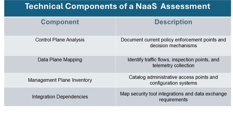 이런 기술 평가는 기존의 보안 제어 지점, 데이터 흐름, 정책 적용 메커니즘을 면밀히 분석해 NaaS 환경에서 새롭게 발생할 수 있는 보안 공백을 식별하는 데 목적이 있다.