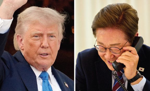 도널드 트럼프 미국 대통령(왼쪽)과 이재명 대통령이 지난달 6일 전화 통화를 하고 있다. 뉴시스·대통령실 제공