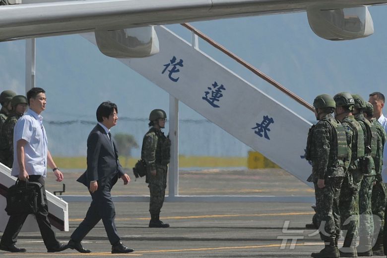 라이칭더 대만 총통이 23일 (현지시간) 연례 한광 합동훈련을 시찰하기 위해 화롄의 공군 기지에 도착을 하고 있다. 2024.07.23 ⓒ AFP=뉴스1 ⓒ News1 우동명 기자