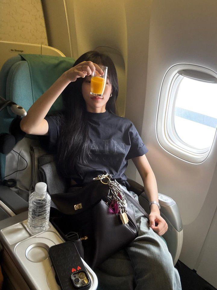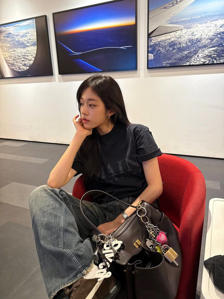 짙은 브라운 계열 가죽 토트백과 키링 액세서리로 개성을 더했고, 무심하게 얹은 실버 워치로 미니멀하면서도 트렌디한 스타일을 보여준다.