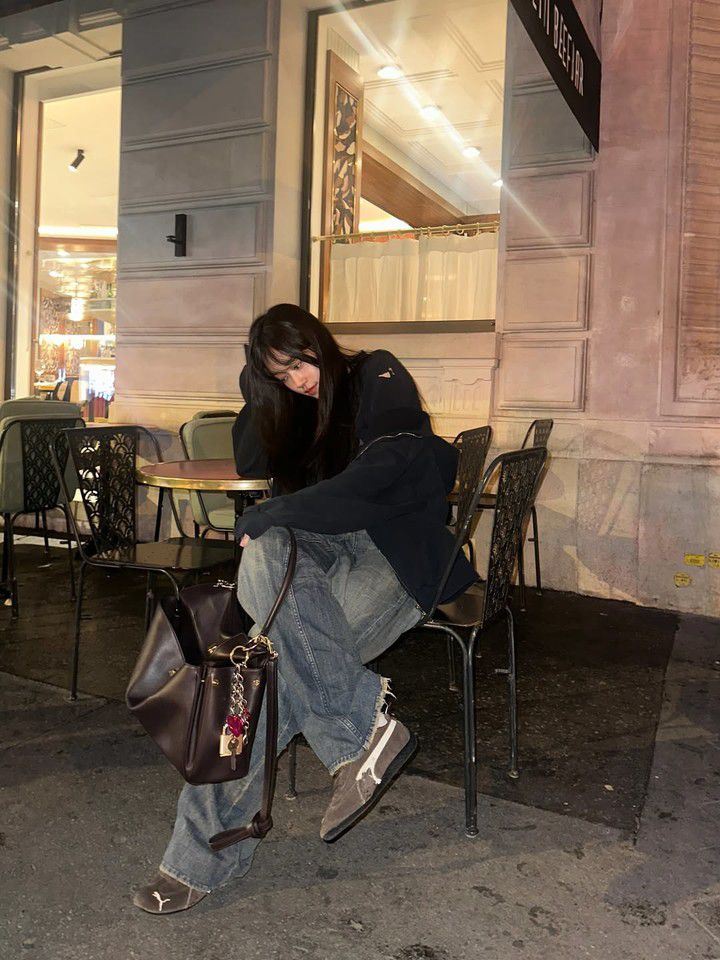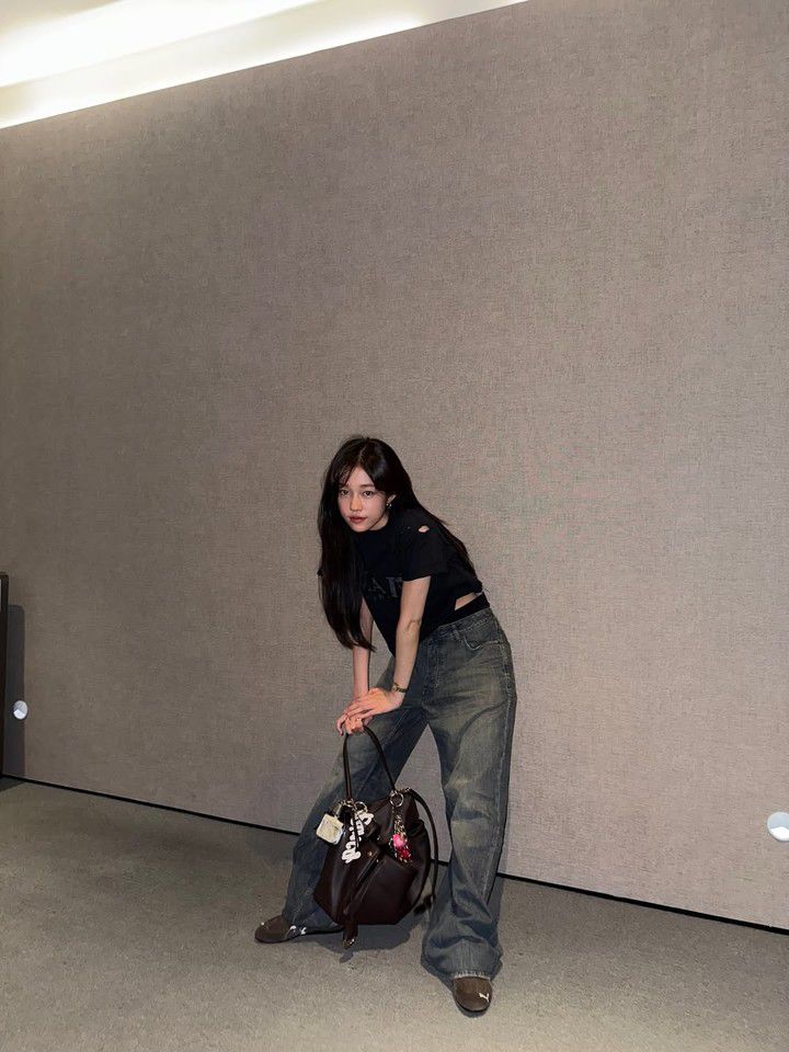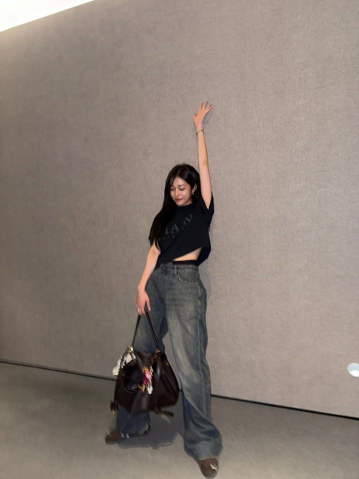 사진 속 노윤서는 블랙 티셔츠와 루즈한 핏의 워싱 데님 팬츠를 매치해 시크한 무드를 완성했다. 특히 데님 팬츠 밑단 사이로 살짝 보이는 브라운 컬러의 스니커즈는 캐주얼한 매력을 자연스럽게 녹여냈다.