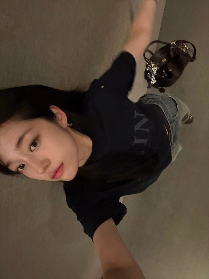 카메라를 아래서 올려다보는 독특한 앵글의 셀카로, 자연스러운 얼굴선과 매끈한 피부가 돋보인다.